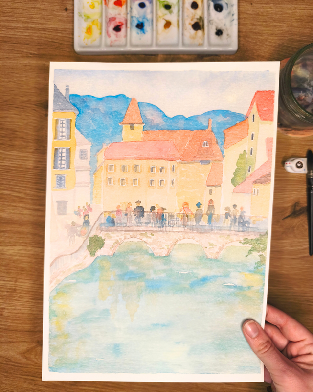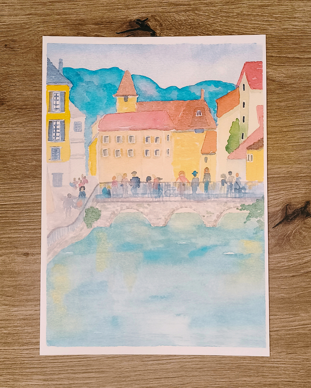 Cette illustration à l’aquarelle est une représentation d’Annecy, inspirée par ses couleurs, son atmosphère et sa sérénité.